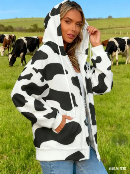 Chic Zip-Up Hoodie with 3D Printed All-Over Cow Print: A Quirky Fashion Pick