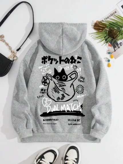 2025 cross-border e-commerce unisex printed hoodie with black cat and letter pattern hoodie, casual and comfortable long sleeved